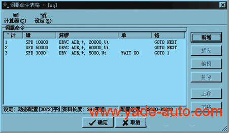 圖5中的第1步:脈沖頻率=10kHz,正轉20000個(gè)單位,動(dòng)作完成GOTO NEXT。